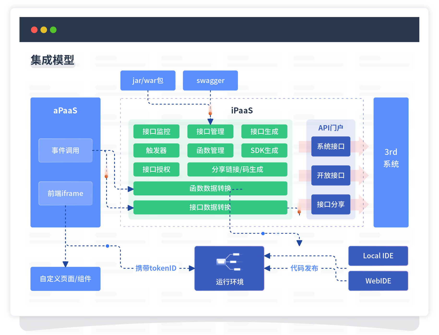 集成模型包括平台本身前、、后端能力的扩展,,,,也支持通过API门户和第三方系统进行交互。。。