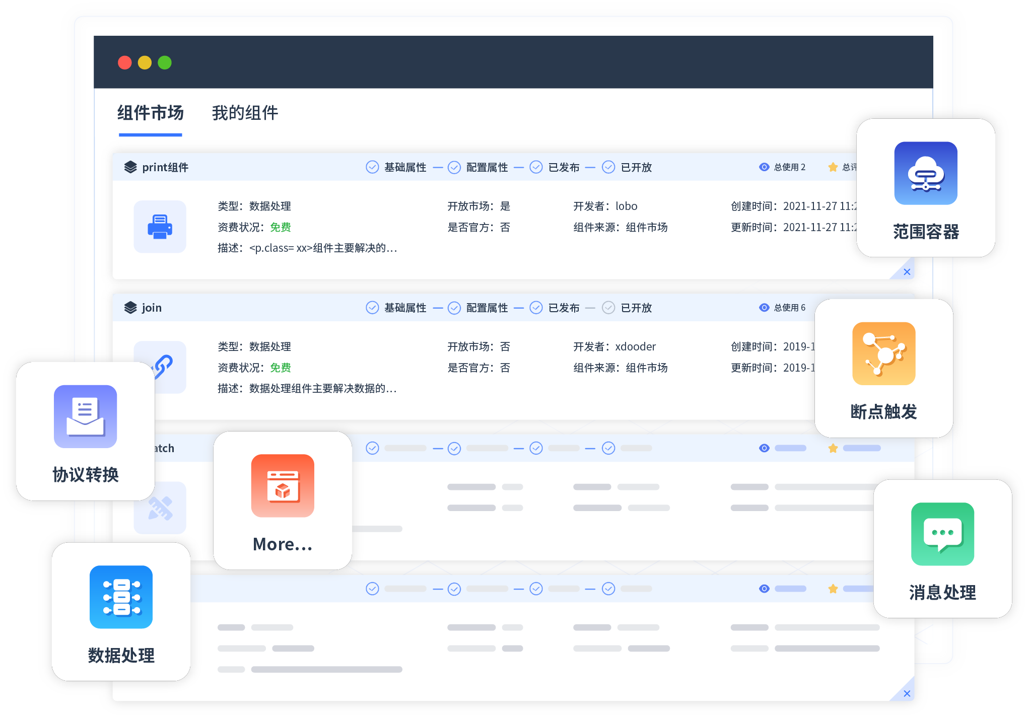 针对集成场景,,,圆梦钱包提供组件市场,,,例如协议转换、、消息处理、、、、文件操作等。。。除平台提供的组件外,,,,客户可以自定义所需组件。。