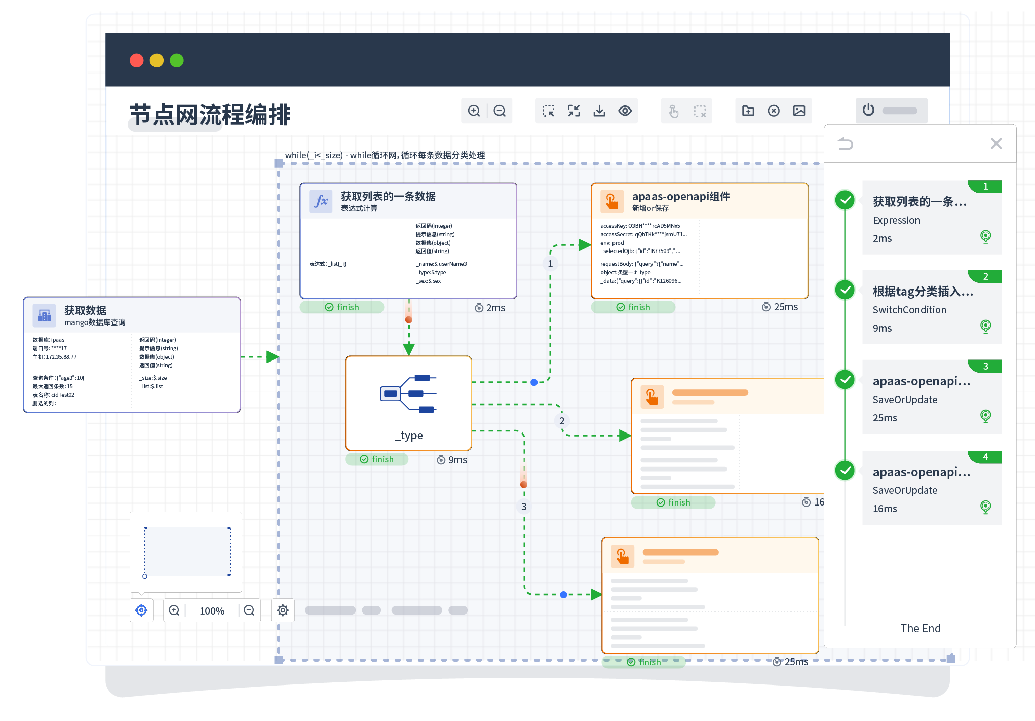 针对集成场景,,,,组件定义后支持进行流程编制,,不同于传统代码方式,,,通过图形化展示,,,支持在线调试、、日志查看和运行回放。。。。